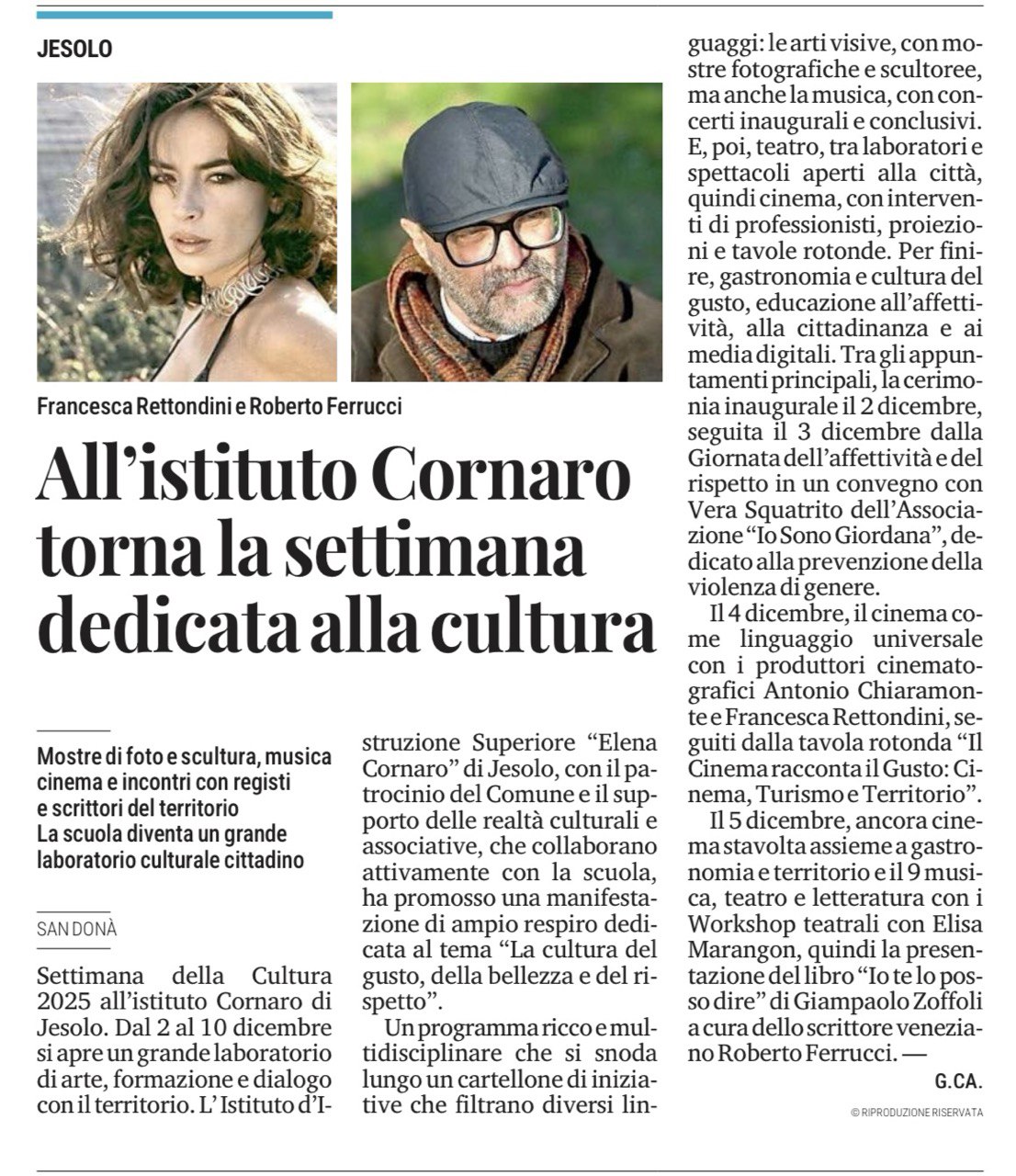 Settimana della Cultura 2025 all’Istituto Cornaro di Jesolo. Dal 2 al 10 dicembre si apre un grande laboratorio di arte, formazione e dialogo con il territorio. L’Istituto d’Istruzione Superiore “Elena Cornaro” di Jesolo, con il patrocinio del Comune e il supporto delle realtà culturali e associative che collaborano attivamente con la scuola, ha promosso una manifestazione di ampio respiro dedicata al tema “La cultura del gusto, della bellezza e del rispetto”.