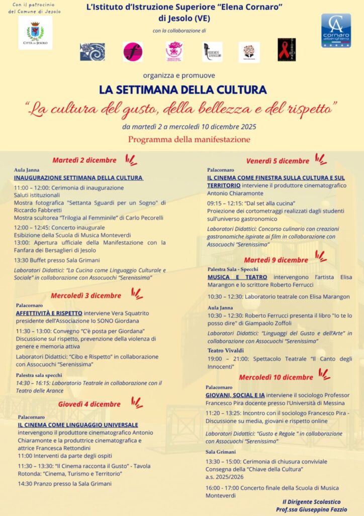 Jesolo, 24 novembre 2025 – L’Istituto d’Istruzione Superiore “Elena Cornaro” di Jesolo, con il patrocinio del Comune di Jesolo e il supporto delle realtà culturali e associative che collaborano attivamente con la scuola, annuncia la Settimana della Cultura 2025, in programma dal 2 al 10 dicembre: una manifestazione di ampio respiro che si conferma tra gli appuntamenti culturali e formativi più significativi per la città e per il territorio.
